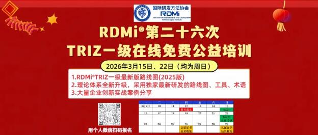 为普及先进的研发方法论,提升企业和个人的创新能力,应对创新中越来越艰巨的挑战,RDMi®将于26年3月15、22日(两天均为周日)联合厦门市科学技术协会、智慧芽等单位线上举办为期2天的TRIZ创新方法一级(基础级)免费公益培训#TRIZ免费培训 ,这也是#RDMi RDMi®(国际研发方法协会)举办的第26次公益培训。市场价值超过5000元的TRIZ创新方法培训,现可免费参加。截至目前累计已有超千家单位的30000多人参加。